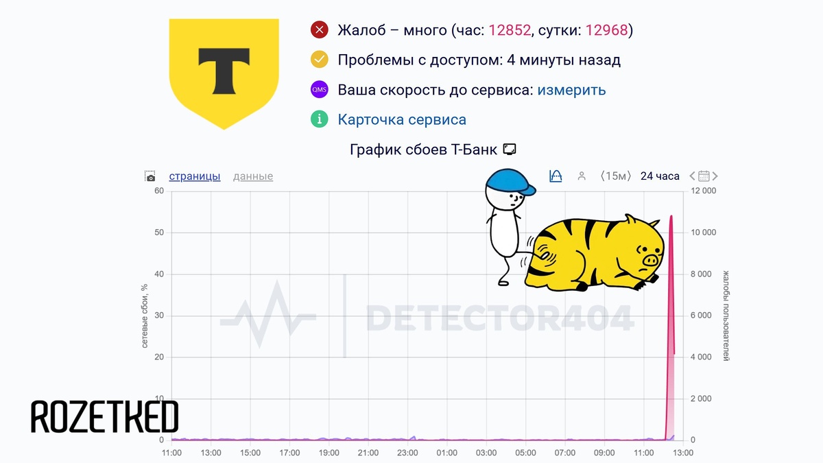 Ресурс Detector404 фиксирует десятки тысяч жалоб от пользователей на недоступность личного кабинета. В последние минуты жалоб стало меньше, но до сих пор приложение открывается не у всех. Обновление (13:05): ресурс показывает, что количество жалоб упало до нуля. Проверьте — всё должно работать. 💼 Rozetked | Подписаться