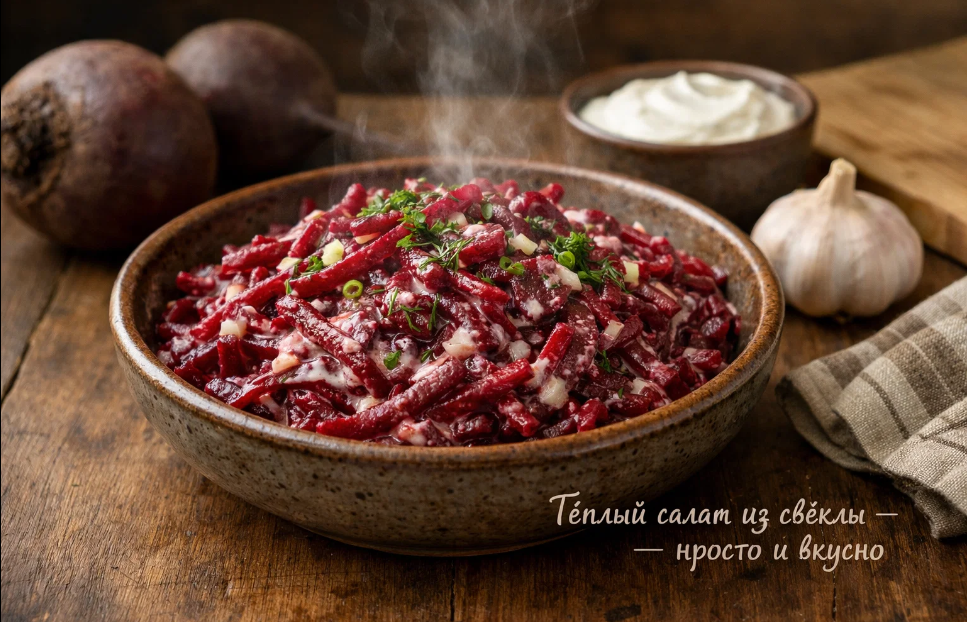 Когда свёкла подаётся тёплой, её вкус раскрывается совершенно по-новому. Исчезает та самая земляная нотка, которая многих отталкивает в сыром или холодном варёном корнеплоде. Появляется мягкость, сладость, почти карамельный оттенок. Сметана добавляет нежности и сливочности. А чеснок — ту самую пикантность, которая превращает простое блюдо в настоящий деликатес.