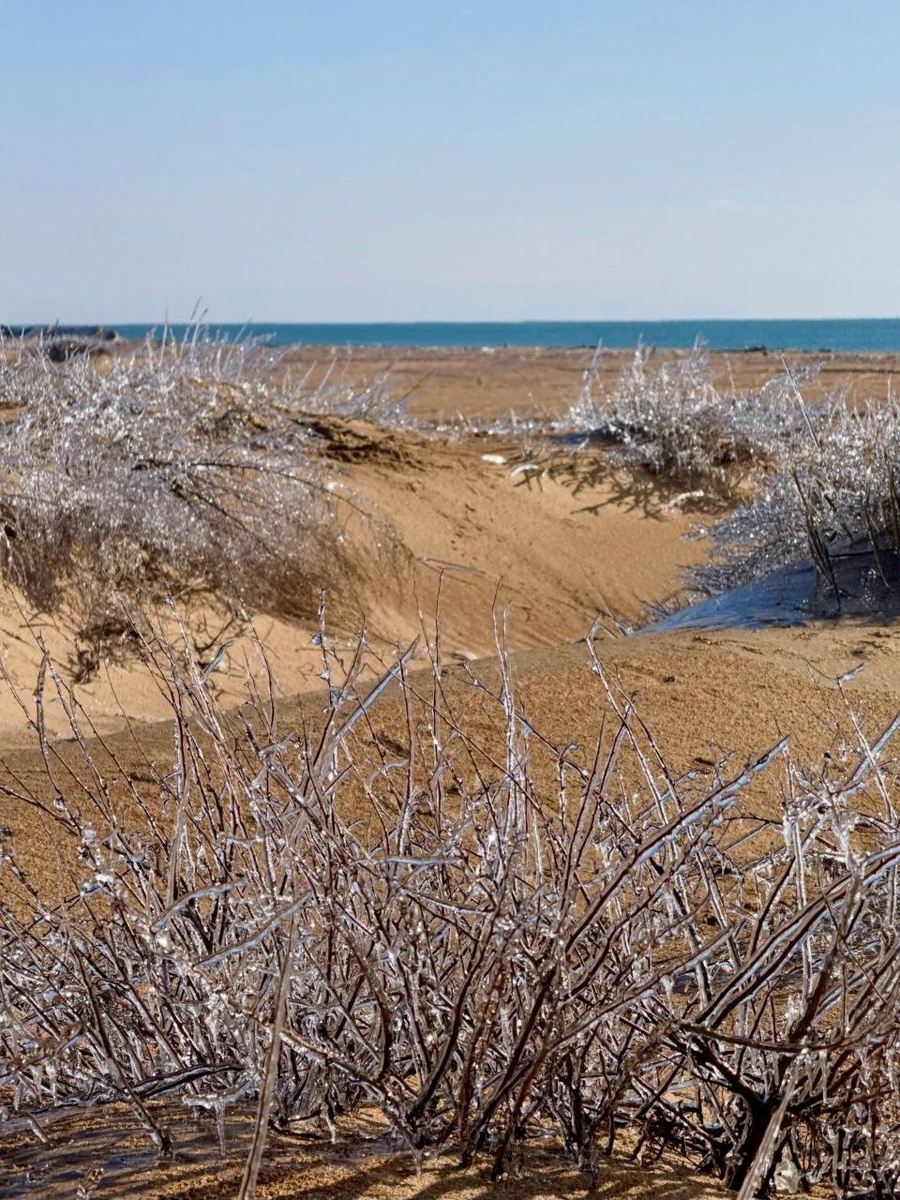 Морозная сказка на центральном пляже станице Благи, под Анапой 😍Каждый кустик на песчаных дюнах покрыт льдом. Всё переливается, словно тысяча бриллиантов, фото не передает всей красоты. А вот глазами смотреть невозможно, искорки так ярко блестят на солнце и слепят. 📷 more_blaga ⛏ Юг Край Мы в МАХ