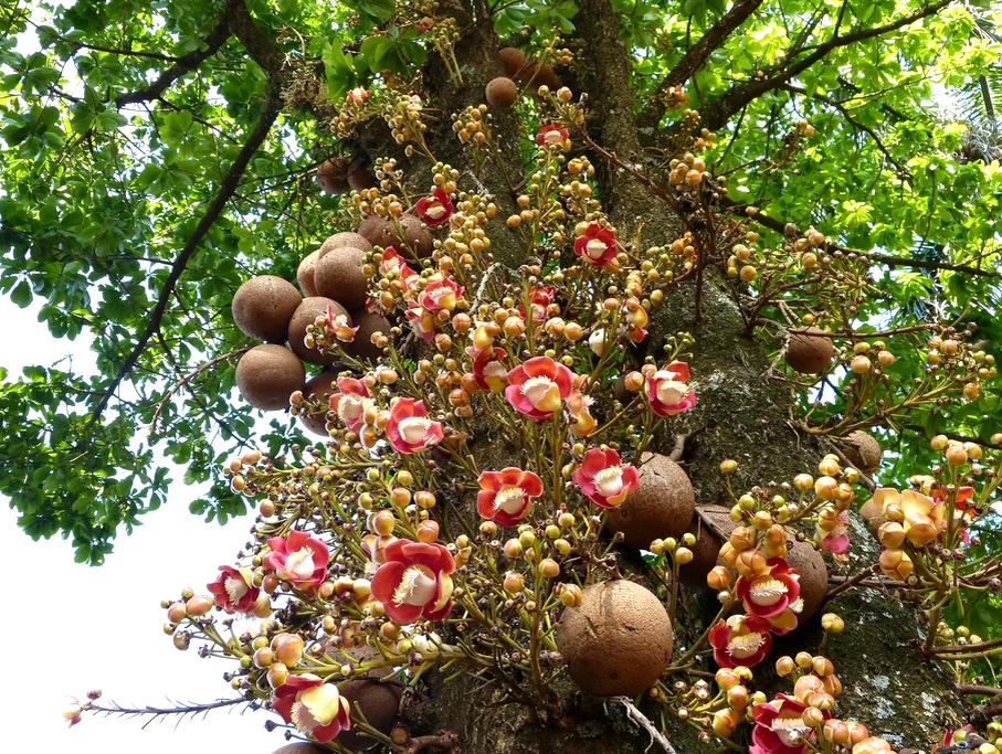 Сами орехи растут внутри очень необычного "фрукта", который больше похож на кокос или даже на пушечное ядро. Это такая большая, круглая, очень твердая коробочка, диаметром 10-15 см, весом до 2 кг! Когда она созревает, то падает с огромной высоты, и это может быть опасно, если оказаться под деревом.