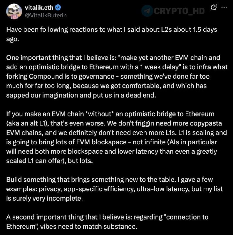 😥 Эпоха копипаст-L2 подошла к концу. Виталик Бутерин прокомментировал дискуссию вокруг L2-блокчейнов: Первая важная мысль. ➥ Я уверен в следующем — «сделать еще одну EVM-сеть и добавить к Ethereum оптимистичный мост с задержкой в одну неделю» — для инфраструктуры это примерно то же самое, что форк Compound для управления. Мы слишком долго делали именно это, потому что привыкли. В итоге это высосало воображение и загнало нас в тупик. ➥ Если создавать EVM-сеть вообще без оптимистичного моста к Ethereum (alt-L1) — это еще хуже. Нам реально не нужно больше копипастных EVM-сетей, и нам точно не нужно еще больше L1. ➥ L1 масштабируется и будет давать много EVM-блокспейса. Не бесконечно много (AI, в частности, потребует и больше блокспейса, и более низкой задержки, чем даже сильно масштабированный L1), но много. ➥ Стройте что-то, что приносит реально новое. Я приводил несколько примеров: приватность, эффективность под конкретные приложения, ультранизкая задержка. Этот список точно дале
