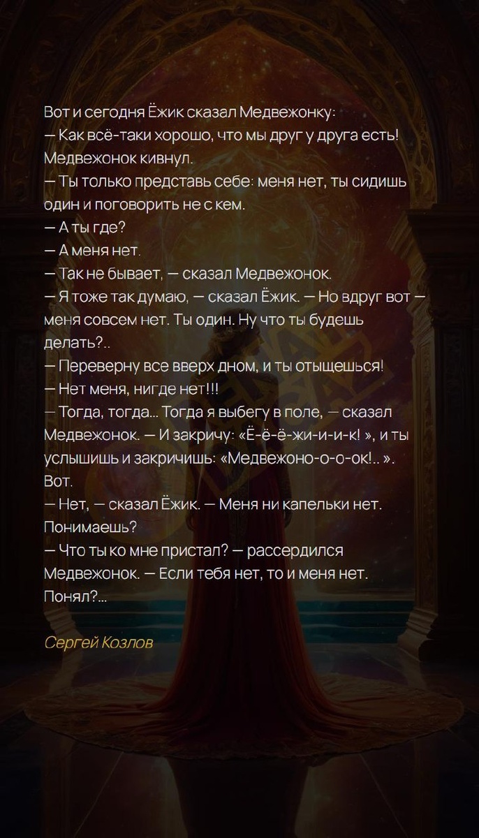 Вот и сегодня Ёжик сказал Медвежонку: — Как всё-таки хорошо, что мы друг у друга есть! Медвежонок кивнул. — Ты только представь себе: меня нет, ты сидишь один и поговорить не с кем. — А ты где? — А меня нет. — Так не бывает, — сказал Медвежонок. — Я тоже так думаю, — сказал Ёжик. — Но вдруг вот — меня совсем нет. Ты один. Ну что ты будешь делать?.. — Переверну все вверх дном, и ты отыщешься! — Нет меня, нигде нет!!! — Тогда, тогда… Тогда я выбегу в поле, — сказал Медвежонок. — И закричу: «Ё-ё-ё-жи-и-и-к! », и ты услышишь и закричишь: «Медвежоно-о-о-ок!.. ». Вот. — Нет, — сказал Ёжик. — Меня ни капельки нет. Понимаешь? — Что ты ко мне пристал? — рассердился Медвежонок. — Если тебя нет, то и меня нет. Понял?… Сергей Козлов Архитектура вашей души | Архитектура вашей души T | VK | Pin | YouTub | Dzen #мышлениемиллионера #душевныйпокой #любовь #синхронность #цель #вдохновись #притяжение #поддержка #благополучие #5число #5февраля