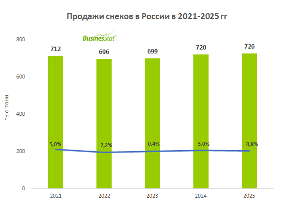 За 2023-2025 гг в России продажи снеков выросли на 4% и достигли 726 тыс т.