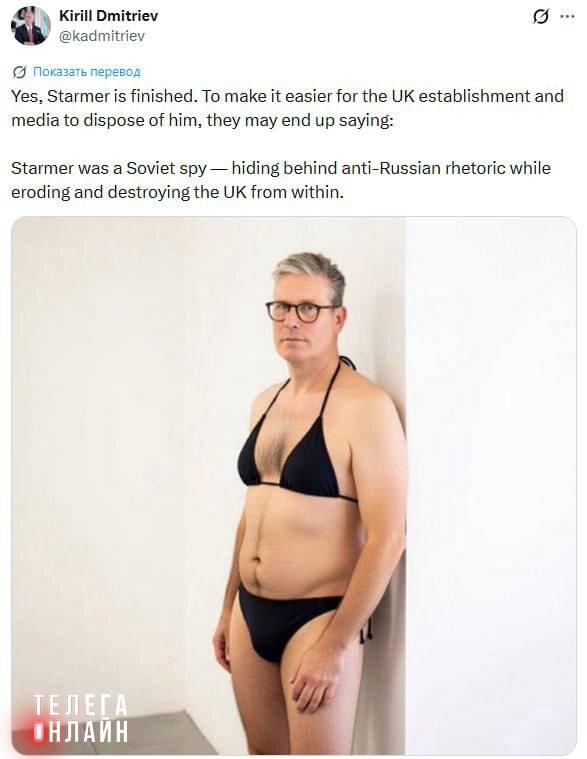 » Глава РФПИ Кирилл Дмитриев, пока продолжает переговоры в Абу-Даби, решил от души помочь британским властям: Да, Стармеру конец. Чтобы облегчить британскому истеблишменту и медиа избавиться от него, они могут в итоге заявить: Стармер был советским шпионом — скрывался за антироссийской риторикой, одновременно разъедая и разрушая Великобританию изнутри. Но, судя по картинке, разделял передовые европейские ценности. 🚲 Подпишись на Телега Online