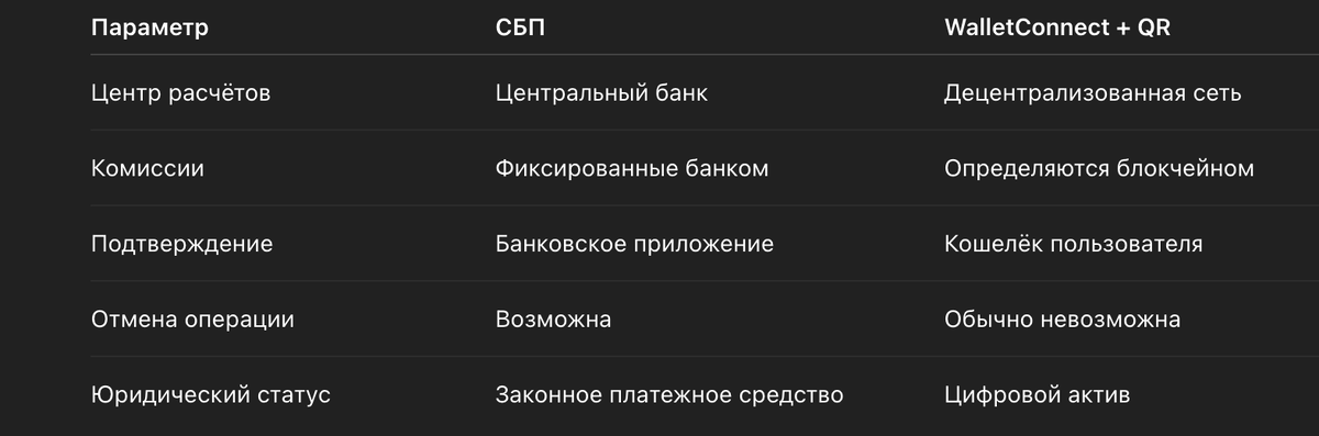 В традиционных финансах Система быстрых платежей (СБП) позволяет переводить деньги между счетами без ввода длинных реквизитов и с подтверждением операции в банковском приложении. В криптовалютной экосистеме прямого аналога СБП нет, но WalletConnect и QR-платежи воспроизводят часть этой логики: они упрощают процесс перевода и снижают риск ошибок при ручном вводе адресов. Для пользователей криптовалют, фрилансеров и арбитражников понимание этих инструментов помогает ускорить операции и оставаться в контроле над своими средствами. WalletConnect — это открытый протокол, который создаёт зашифрованное соединение между кошельком пользователя и децентрализованным приложением (dApp). Протокол не хранит средства и не проводит транзакции от имени пользователя. Он лишь передаёт запрос на подпись. Основные действия при использовании WalletConnect: Приватные ключи остаются в кошельке пользователя, что снижает риск компрометации. WalletConnect Docs QR-коды используются для передачи адреса и суммы тра