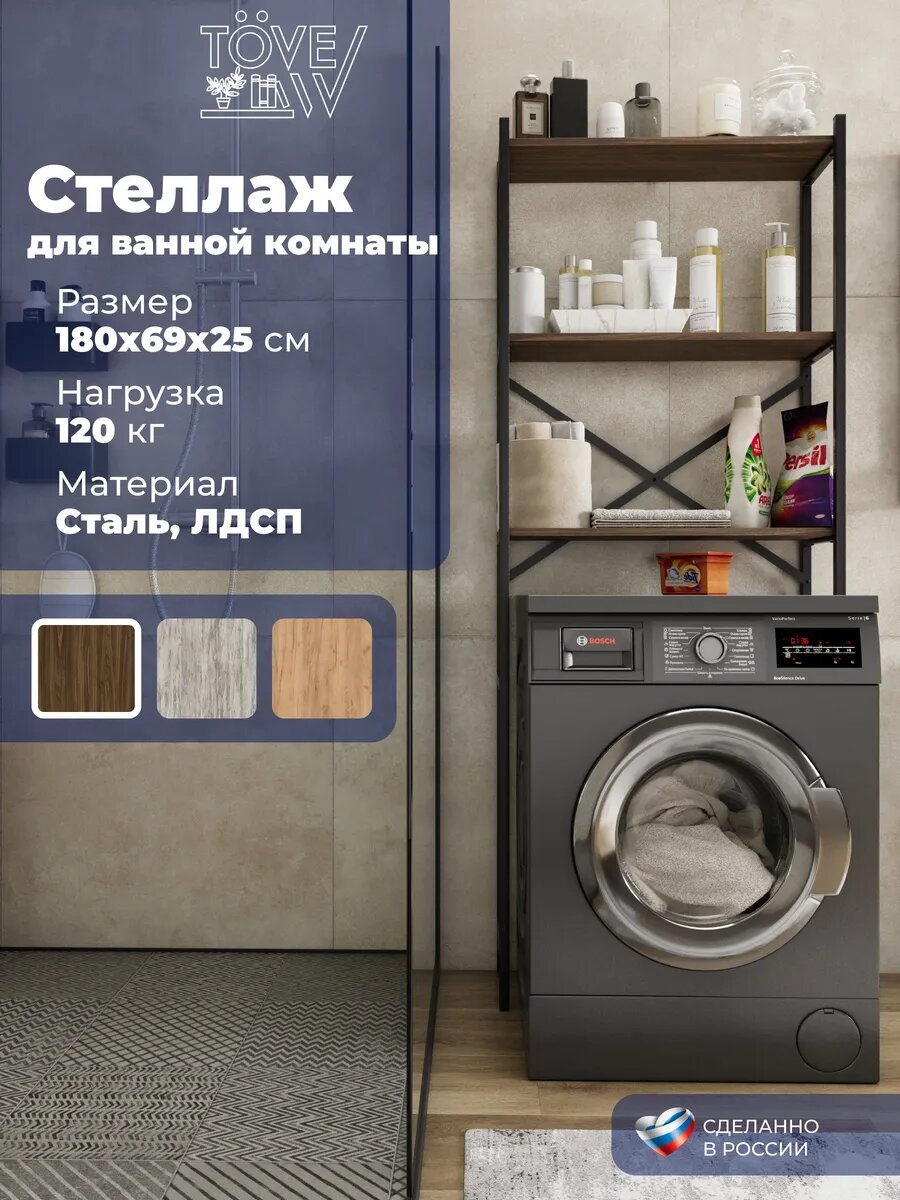 Напольный трёхъярусный стеллаж из металла и дерева в стиле лофт — спасение для маленькой ванной или санузла. Он освобождает пространство над стиральной машиной, предоставляя удобные полки для стиральных средств, косметики и банных принадлежностей.