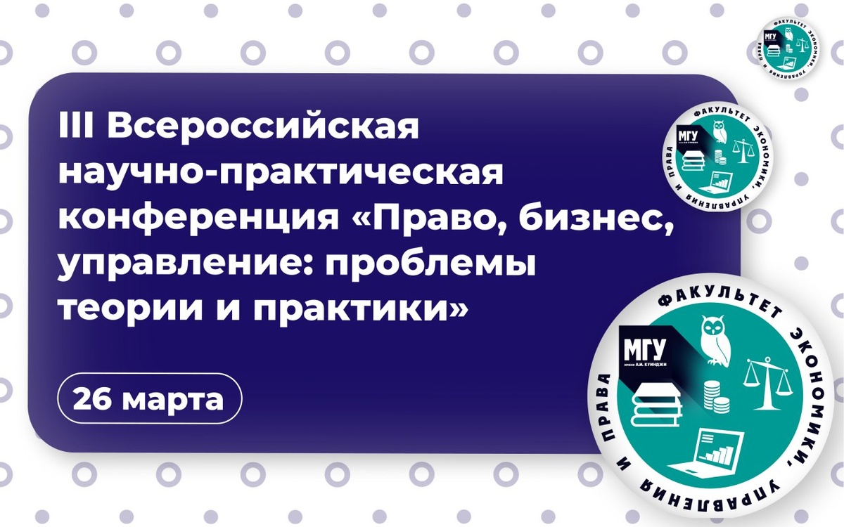 И. Куинджи состоится III Всероссийская научно-практическая конференция «Право, бизнес, управление: проблемы теории и практики» 🌺К участию в конференции приглашаются обучающиеся, аспиранты, представители научных и образовательных организаций, органов государственной власти и местного самоуправления, предприятий реального сектора экономики, общественных организаций, а также другие заинтересованные лица. 🌺Планируется работа по следующим направлениям: 🌺Современное развитие законодательства и правоприменения в РФ. 🌺Актуальные вопросы государственного и муниципального управления. 🌺Экономика и финансы: интеграция, оптимизация и взаимодействие с реальным сектором. 🌺Бизнес менеджмент. 🌺Юридическое образование. 🌺Для участия необходимо до 20 марта 2026 года заполнить форму и направить тезисы доклада. 🌺По итогам конференции на официальном сайте МГУ имени А.И. Куинджи будет размещен сборник научных статей. Подробнее — в информационном письме. 👻 MAX|💙ВК|📝Дзен|🤩Сайт #МГУимениКуинд