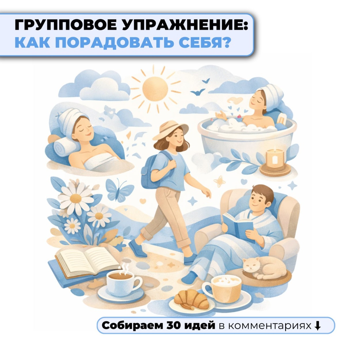 Когда жизнь превращается в список «надо», радость откладывается на потом. А ресурс не любит «потом». Ему нужны регулярные сигналы: мне хорошо, мне приятно, я живу, а не только справляюсь. ➡️Давайте сделаем небольшое групповое упражнение, которое разбавит будни и добавит больше радости в день. Мы начинаем - вы продолжаете в комментариях. 🔵Цель - собрать вместе 30 идей, как можно порадовать себя.💙 Топ-🔟 способов порадовать себя 1. Прогулка в парке и самый вкусный напиток без повода 2. Спа или мини-спа дома: ванна, маска, скраб, тишина 3. Любимый сериал или фильм 4. Красивый завтрак или ужин «как в кафе», но дома 5. Маленькая покупка, которая радует глаз: свеча, крем, блокнот, цветы 6. Час тишины без чатов, новостей и чужих задач 7. Что-то для тела: массаж, сауна, растяжка, йога - что вам подходит 8. Встреча или звонок человеку, рядом с которым легко 9. Посетить новое место: кофейня, выставка 10. «День без требований»: 2-3 простых дела и больше ничего обязательного 💬 Теперь вы: Пи