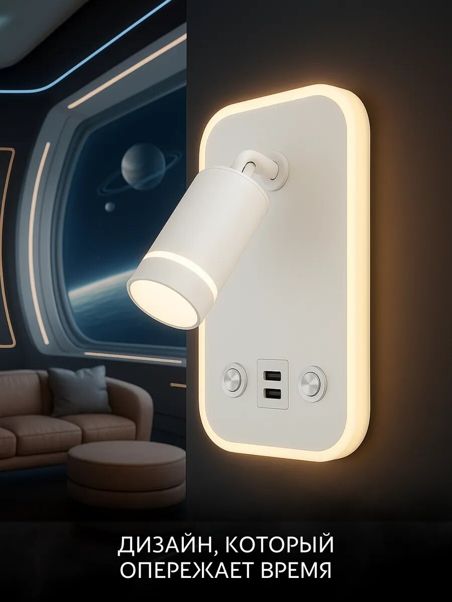 Стильный поворотный светильник-бра с сенсорным управлением и диммированием. Имеет встроенные порты для быстрой зарядки гаджетов через USB и Type-C (2А). Корпус из алюминия в черном или белом цвете.