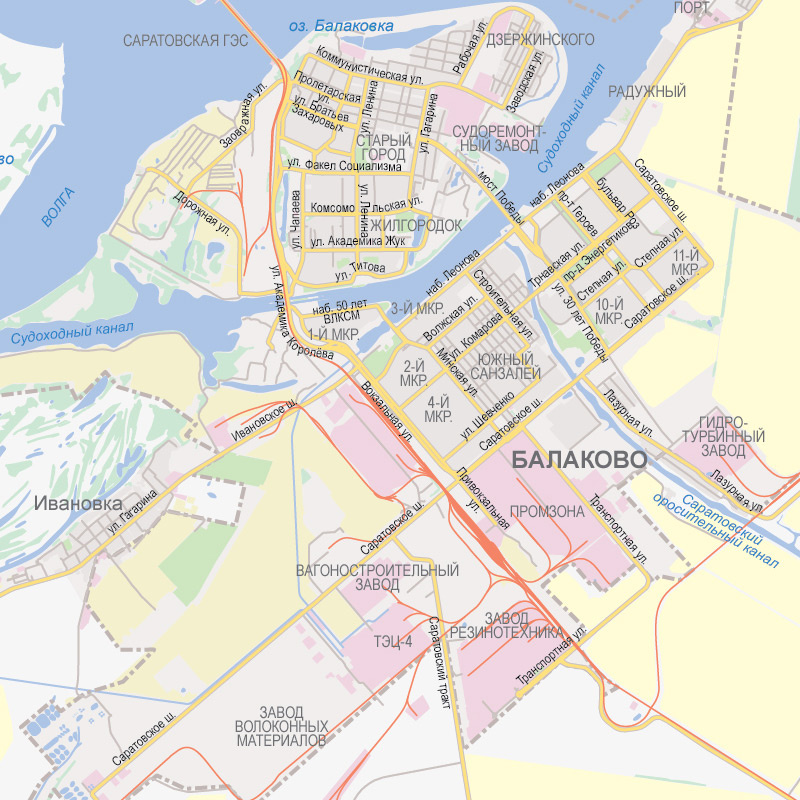 На карте посередине судоходный канал с шлюзами. Он возник при строительстве ГЭС. Наверху исторический центр, расположенный теперь на острове - "Старый город". Посередине новый Балаково и внизу заводы.