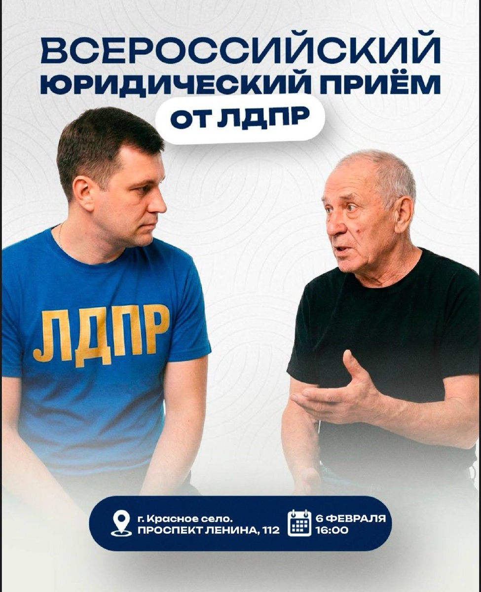 6 февраля в 16:00 в Санкт-Петербурге состоится Всероссийский юридический приём ЛДПР. Если у вас есть вопросы по защите прав, ЖКХ, трудовым спорам или другим правовым темам - вы можете получить бесплатную юридическую консультацию от специалистов. 📍 Адрес: Город Красное село. Проспект Ленина, 112 ⏰ Время: 6 февраля, 16:00 ❕Обязательна предварительная регистрация ЛДПР рядом, когда нужно отстаивать права граждан! 🔗 Мы ВКонтакте 🖥 Сайт ЛДПР | Санкт-Петербург