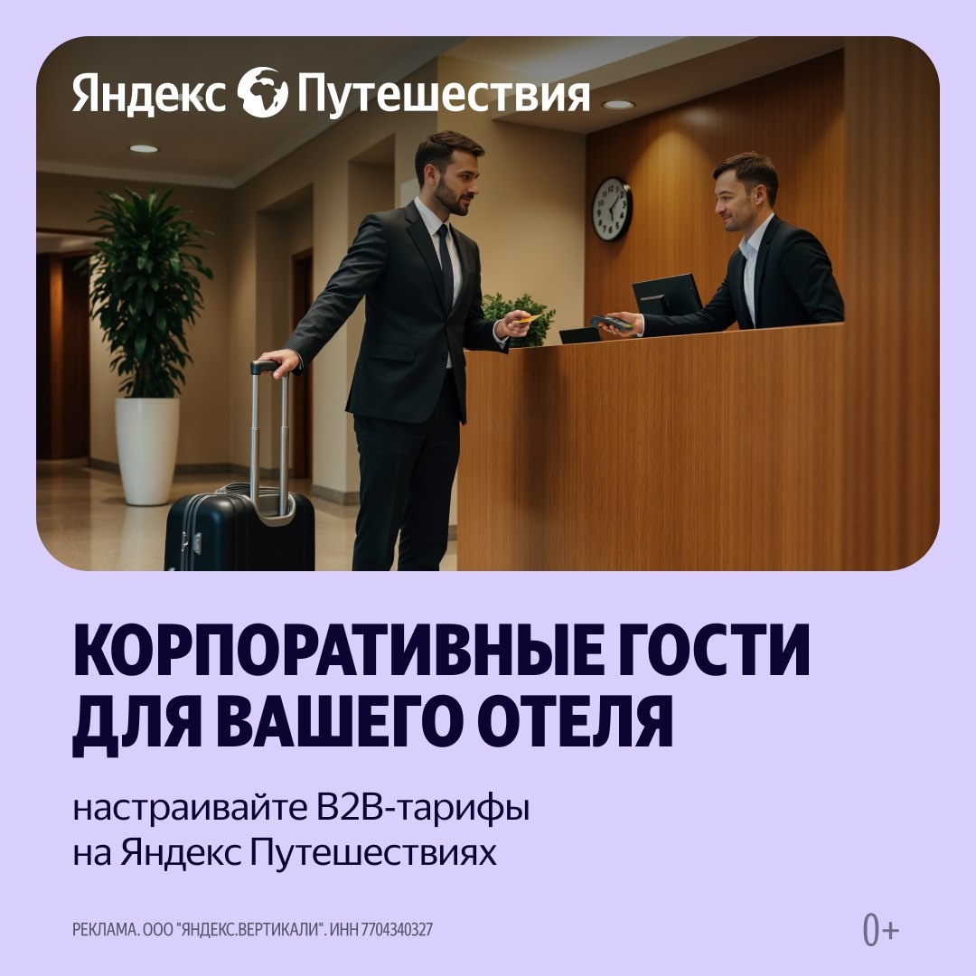 Бизнес-аудитория помогает отелю выравнивать сезонность — поддерживать загрузку и выручку в будние дни и периоды снижения туристического спроса. Чтобы системно развивать этот сегмент, важно быть заметными там, где бронируют компании и travel‑агентства. B2B‑тарифы на Яндекс Путешествиях помогают привлекать корпоративных гостей без запуска дополнительных каналов и сложных интеграций: вы задаёте специальные условия, которые видят только бизнес‑пользователи сервиса. 👉 Отели, работающие с B2B‑тарифами на Яндекс Путешествиях, отмечают следующие результаты*: • до +53% к бронированиям и до +50% к выручке на сервисе; • до 30% повторных заездов от корпоративных клиентов; • 60% бизнес‑гостей выбирают номера средней и высокой категории; • дополнительный доход за счёт завтраков, room service, парковки, раннего заезда и позднего выезда; • повышение загрузки в будние дни и низкий сезон. 📌 B2B‑тарифы гибко настраиваются в Экстранете и помогают продвигать отель среди тысяч корпоративных заказчиков.