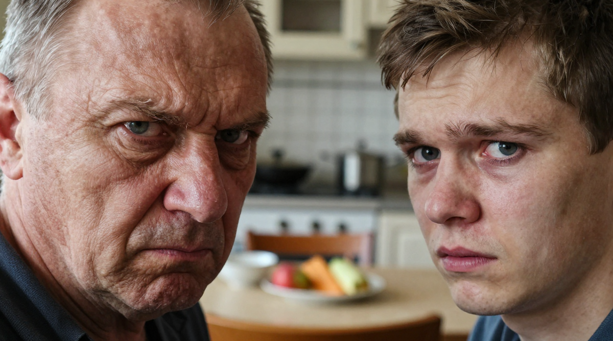 Виктор Петрович, отец Дениса, сидел неподвижно, глядя на сына тяжелым, немигающим взглядом. Он только что вернулся со смены, устал, мечтал о спокойном ужине, а вместо этого получил пощечину. Прямо за семейным столом.