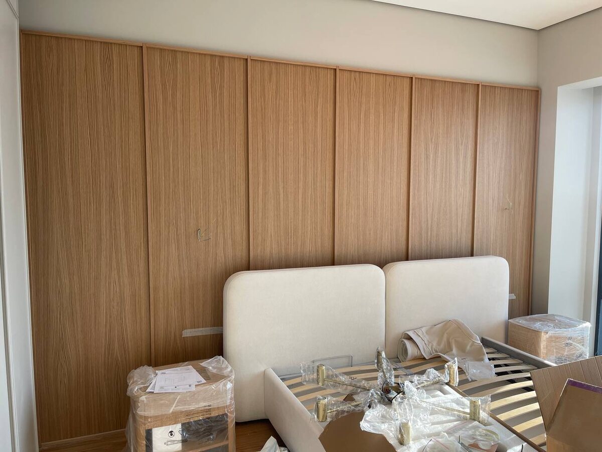 Спальня в шпоне дуба и эмали с интегрированными ручками из массива.