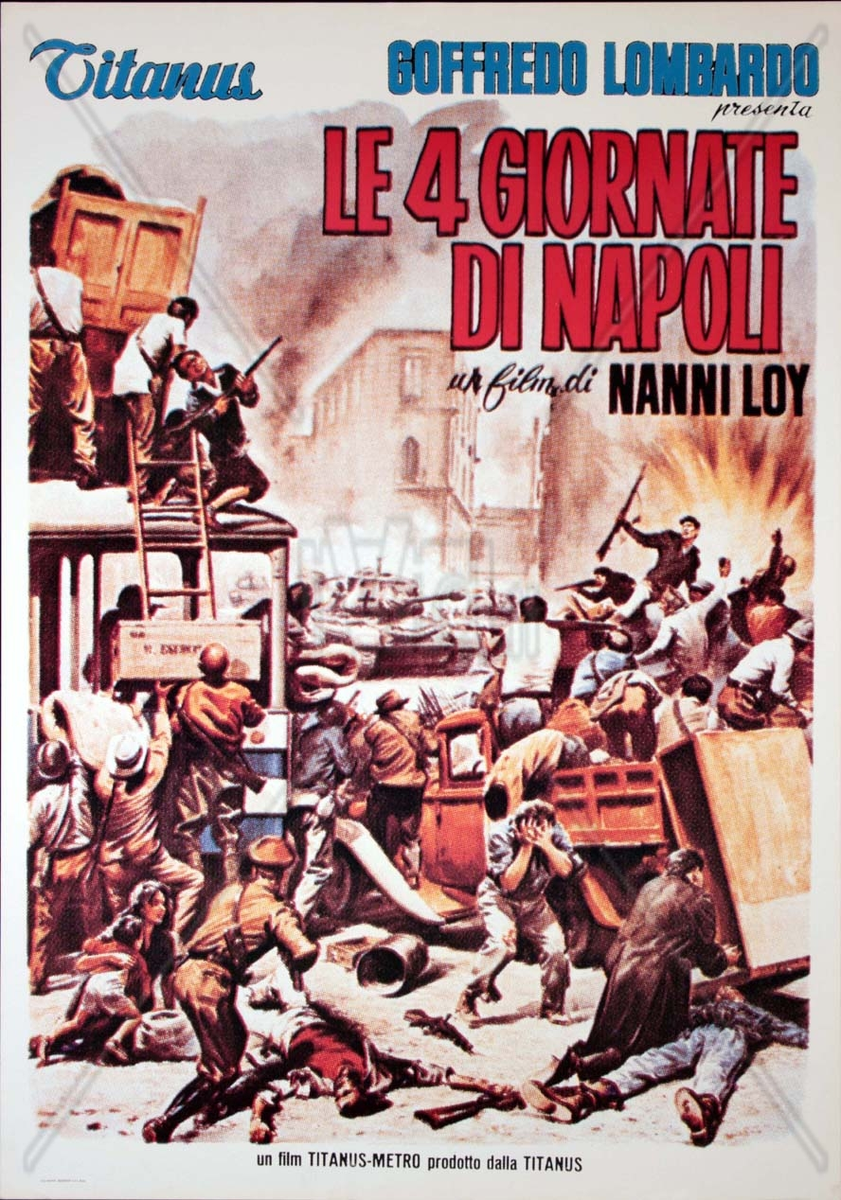 Четыре дня Неаполя / Le Quattro giornate di Napoli. Италия, 1962. Режиссер Нанни Лой. Сценаристы: Паскуале Феста Кампаниле, Массимо Франчоза, Нанни Лой, Васко Пратолини. Актеры: Джан Мария Волонте, Реджина Бьянки, Альдо Джуффре, Шарль Бельмон, Фрэнк Вольф, Луиджи Де Филиппо, Жорж Вильсон, Леа Массари, Жан Сорель и др. Драма. Премьера: 15.11.1962. Прокат в Италии: 4,2 млн. зрителей (19-е место в сезоне 1962/1963). Прокат в СССР – с 25.10.1965: 8,8 млн. зрителей.