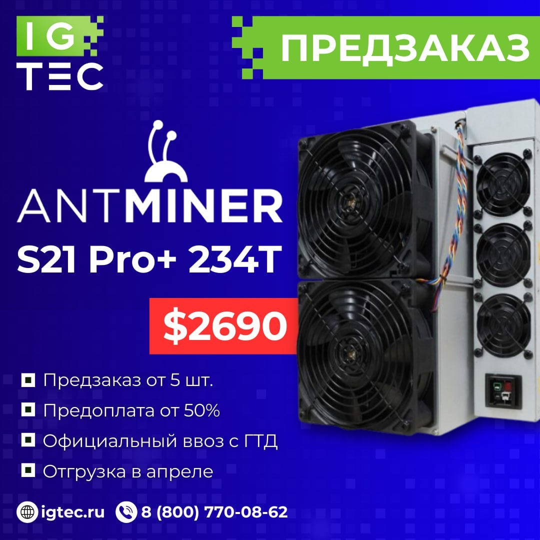 ⚡️ЦЕНА ПРЕДЗАКАЗА — 2690$⚡️ Характеристики Antminer S21 Pro+: 🔗Алгоритм: SHA-256 ⚡️Хешрейт: 234 Th/s 🔌Потребление: 3510 W 🔋Эффективность: 15 J/T 🔹Предзаказ от 5 шт. 🔹Предоплата от 50% 🔹Официальный ввоз с ГТД 🔹Отгрузка в апреле Для покупки обращайтесь к менеджеру 📱 Telegram: @igtec_manager ☎️ 8(800)770-08-62 Наш сайт / FAQ-бот / О компании