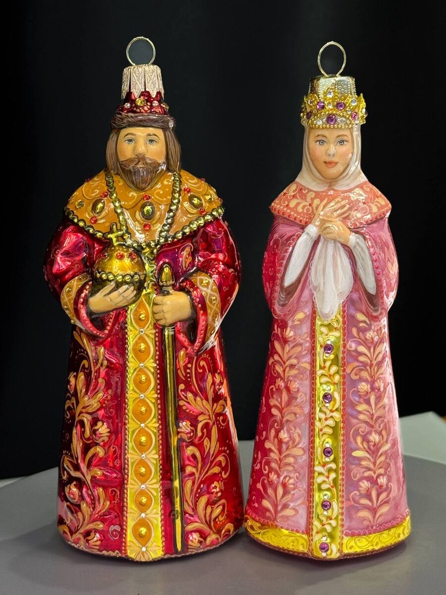 — теми, кто бережно несёт в себе сказку. Особенно художниками. Теми, у кого рука помнит слово, а сердце — пушкинскую интонацию. Одна из таких художниц — Алина Бурмистрова, мастер из Санкт-Петербурга. В её росписях слышится дыхание Сказка о царе Салтане — не громкое, не сценическое, а домашнее, рассказанное вполголоса. Её царь Салтан и царица словно сошли со старых иллюстраций — в традиции Ивана Билибина где орнамент не украшает, а говорит. Лица — тонкие, одухотворённые, уверенные и по-настоящему царственные. У царицы — изящные пальцы и ажурный платок, жест тишины и заботы. У царя — цветочный орнамент на платье, живой и мягкий, словно сама сказка прорастает через стекло. Золото здесь не блестит — оно светится, как память детства, как страницы любимой книги. ✨ Важно: работы Алины Бурмистровой — авторские, не для продажи. Они созданы для души, как художественное высказывание. 🎄 При этом царя Салтана и царицу в росписи нашей фабрики вы можете приобрести на сайте «Жар-Птица»: 👉 https