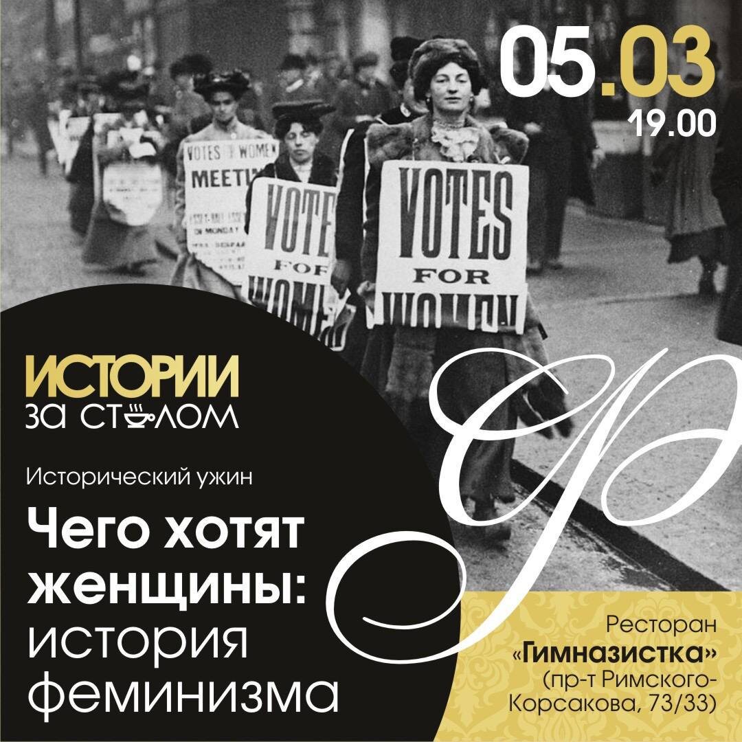 » 5 марта в 19.00 Ресторан "Гимназистка" (пр-т Римского-Корсакова, 73/33) На встрече от историка культуры Анны Михайловой мы узнаем: ✨как женщины России, Европы и Америки отстаивали свои права в 19-20 веках; ✨как писательницы Жорж Санд, Вирджиния Вулф и Симона де Бовуар внесли свой вклад в историю феминизма; ✨узнаем предысторию: как феминизм связан с Античной философией, как женщина воспринималась в Средние века и в какую эпоху была выдвинута идея равноправия полов; ✨и, конечно же, поговорим о том, в чем смысл 8 марта и причём здесь Клара Цеткин и Роза Люксембург. В меню: 1️⃣Салат с лососем слабой соли; 2️⃣Пирожок с корнеплодами; Утиная ножка с солодовой капустой; 3️⃣Десерт «Гимназистка»; 4️⃣Морс; 5️⃣Чай. Стоимость - 6490 рублей на человека. 🎟️ билеты можно купить в личных сообщениях @AnnaShuniaeva