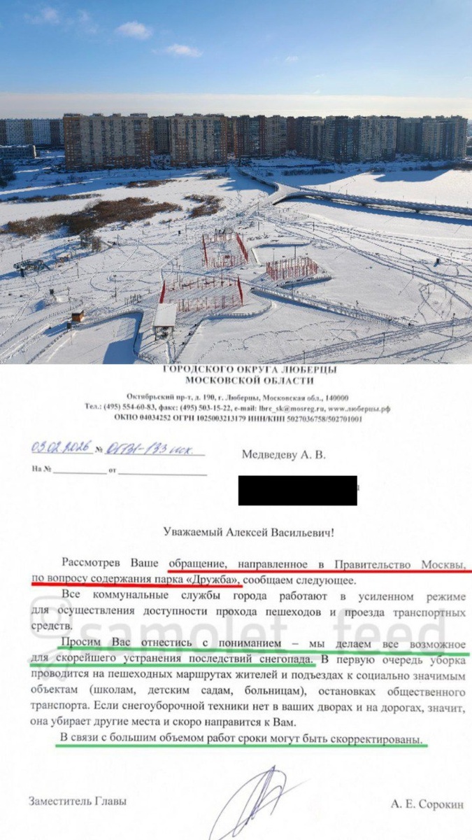 о. Люберцы по вопросу содержания парка "Дружба" на Чёрном озере. Просим Вас отнестись с пониманием - мы делаем все возможное для скорейшего устранения последствий снегопада. В первую очередь уборка проводится на пешеходных маршрутах жителей и подъездах к социально значимым объектам (школам, детским садам, больницам), остановках общественного транспорта. Если снегоуборочной техники нет в ваших дворах и на дорогах, значит, она убирает другие места и скоро направится к Вам. В связи с большим объемом работ сроки могут быть скорректированы. ________ Присылать новость @mstislavz 👉 Обсудить в чате ЖК 👉 Подписаться на канал 📲 Мы в MAX