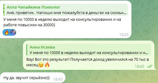 ⏺Одна часть очень боится потерять стабильный доход, а другая- хочет делать то, что нравится, к чему лежит душа . ➡️ Знакомьтесь, Анна, участница моего практикума пришла с запросом примерить в себе эти две части. Она работник банковской сферы и психолог. Долго откладывала запуск группы, проявляться в соцсетях и заявлять о себе. В итоге после программы увеличила свой доход на 70 тыс. в месяц! ♥️ Как? Ей увеличили оклад в банке на 30 тысяч и 10 тысяч в неделю она получает от работы с клиентами. Считайте сами... И конечно она начала активно проявляться- заявлять о себе на других соц. площадках! Кстати, эфир, который пришлось отложить, пройдет завтра в пятницу 6 февраля в 12ч по Мск. в чате воркшопа! Приходите! ⏺Запись будет только для тех, кто в чате воркшопа!