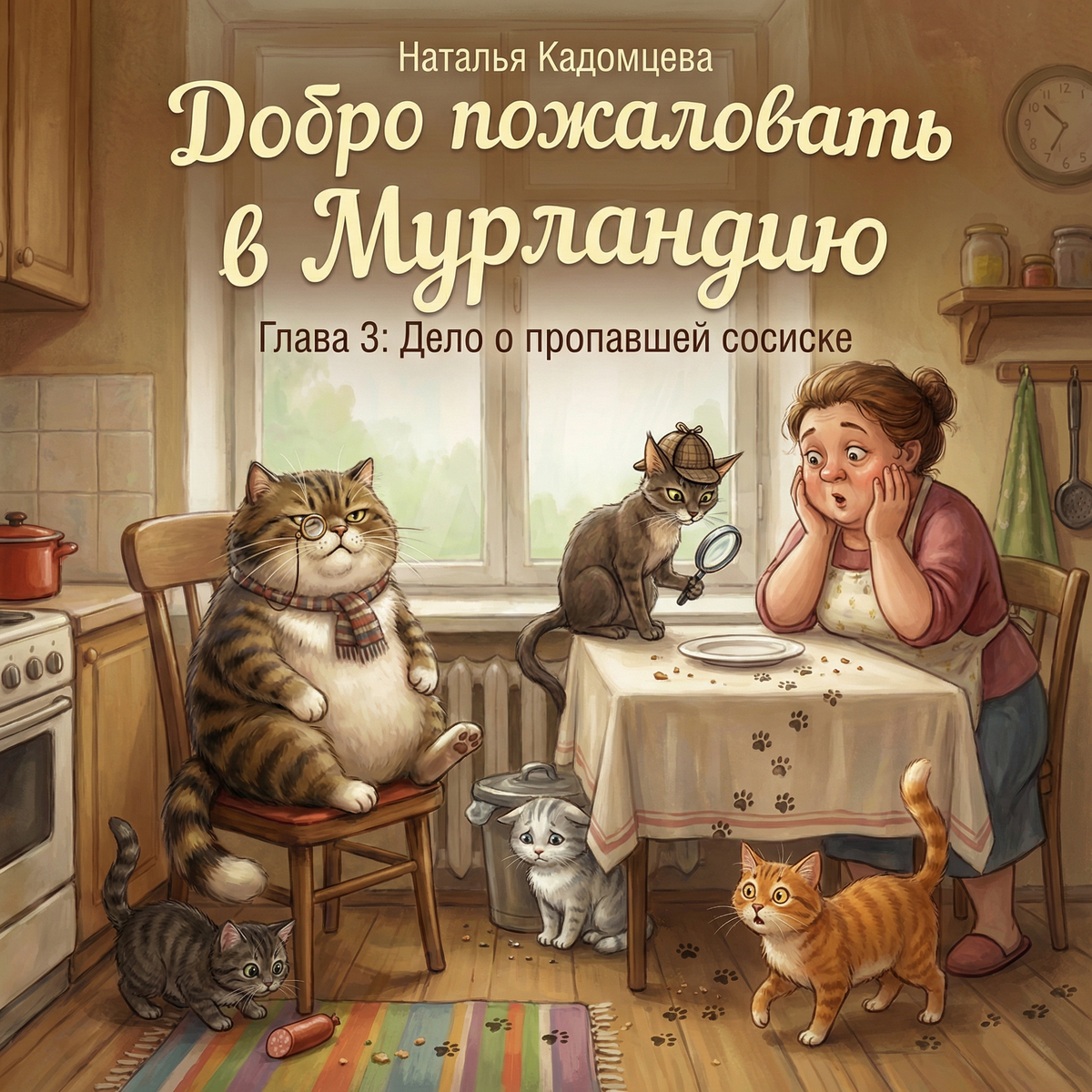 В Мурландии, как и в любом цивилизованном мире, есть свои легенды. Самая главная и самая волнующая – о колбасе. Колбаса иногда появляется на обеденном столе, а потом внезапно исчезает в неизвестном направлении. Хозяйка уверена в том, что «Я точно положила вот сюда». Кошки уверены в том, что «Вселенная даёт, вселенная забирает». В тот день колбаса исчезла особенно нагло: прямо из тарелки, пока Хозяйка отвернулась на секунду, чтобы выключить вскипевший чайник. Хозяйка строго спросила: - Кто?! Все кошки сделали одинаковое лицо: «Я бы никогда». Кроме Рыжика. Рыжик сделал лицо: «Я бы, конечно, никогда… но вообще идея интересная». Началось расследование. Генерал назначил Лиру следователем, потому что у Лиры был бесценный опыт: она однажды нашла потерянный пакетик по одному звуку шуршания, который отложился у неё в памяти. Лира прошлась по кухне, понюхала воздух и внимательно посмотрела на Кнопку. Кнопка разглядывала потолок так убедительно, что потолок захотел признаться сам. Снежок сидел в