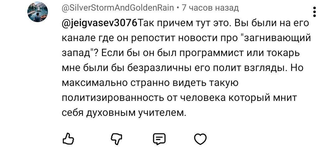 ... Причем почему то товарищ загнивающий запад взял в кавычки 😂😂 Видимо не согласен 😂 Друзья, прелесть моего положения по сравнению с теми, кто мнит тебя духовным учителем просто невероятная Во первых, я не заинтересован в росте поклонников и мнимых учеников Во вторых, я могу открыто говорить то, что думаю, даже дуракам В третьих, я могу не называть оплату за подписку благодарностью, а переводы кошкам донатами. В четверых, я могу говорить, что в жизни себя к этой когорте духовных учителей никогда не причислял и не дай бог. 😱 Но больше всего мне нравится то, что всегда появляются те с кем не скучно 😂😂 Ну и главное, можно не играть в демократию и свободу слова. Не нравится? Блокировка p.s. Друзья, главное - отписывайтесь, если не соответствую требованиям. Не мучайте себя чтением постов в этой группе. А то бывает человек возмущается и дизлайки ставит, но не переключает 😂.