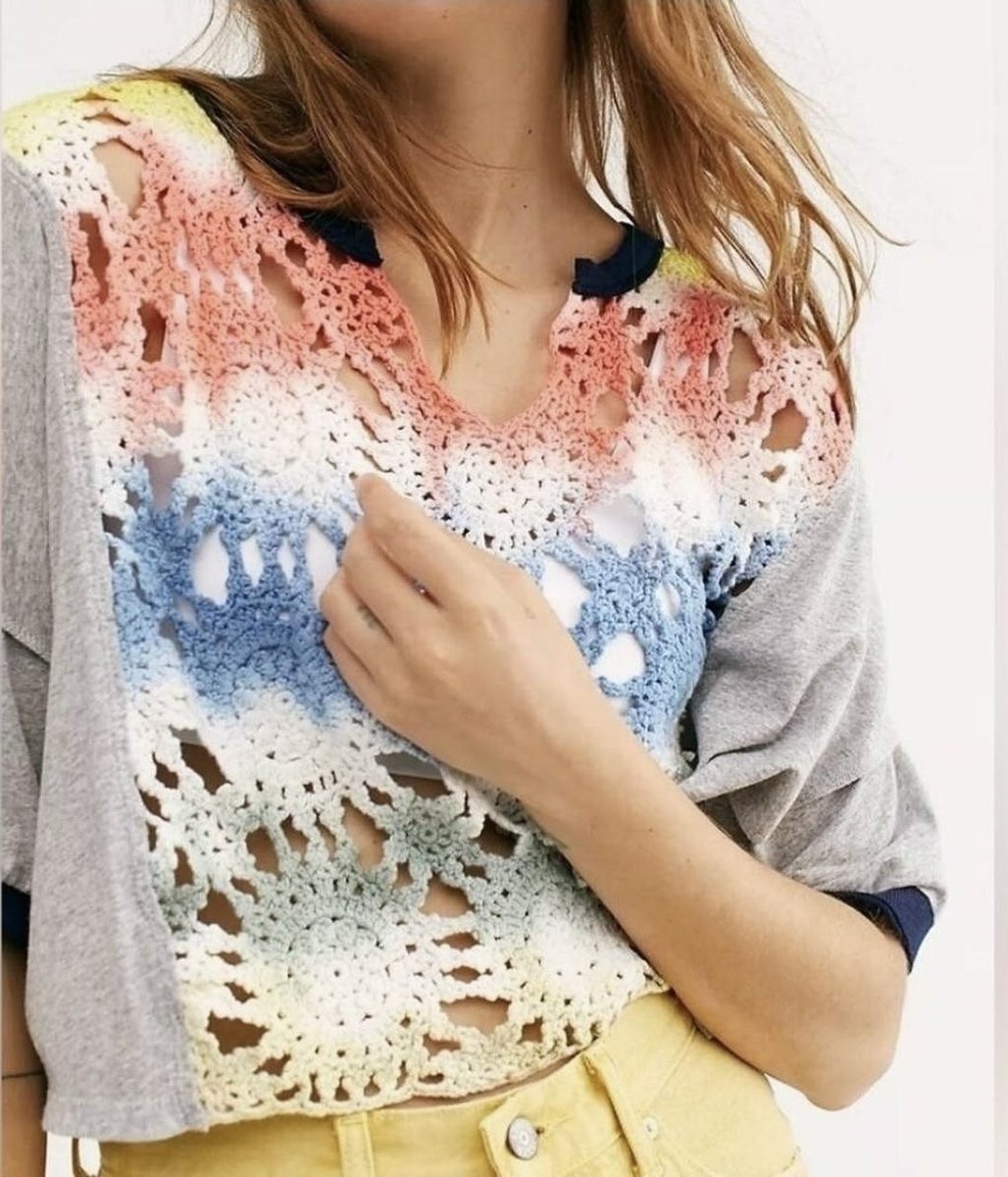 Жакет, который представлен ниже связан крючком из пряжи со средними по длине переходами и выглядят они с эффектом рваных секций.