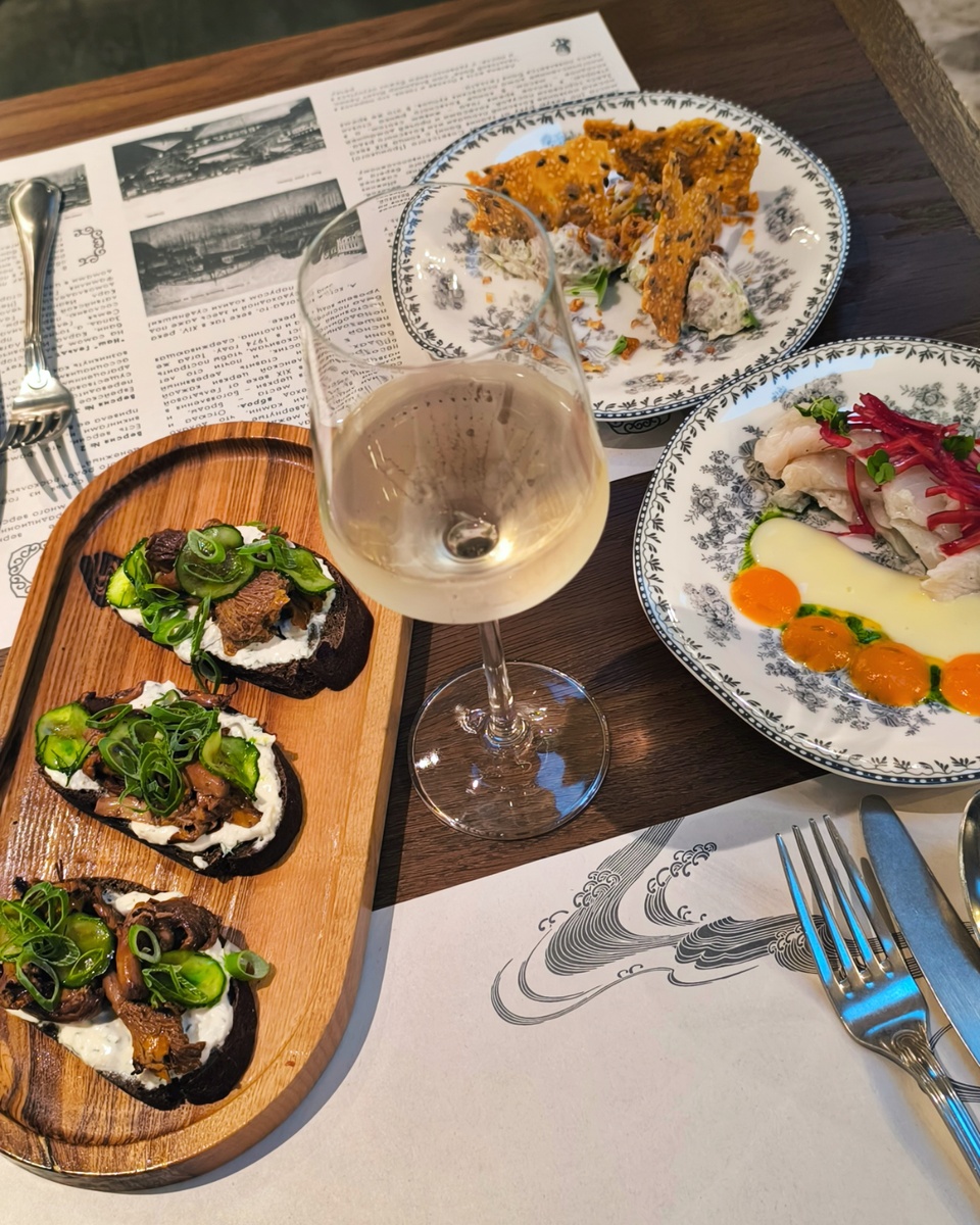 Одно из открытий этого года — потрясающее заведение Гельдт в Финском парке в Пскове. Его мне рекомендовал один товарищ, но, признаться, мимо тоже не пройти. Единственное, погода была не очень в августе, потому нам не посчастливилось поужинать на веранде возле реки. Но и внутри довольно приятно! Вообще Гельдт — это не только ресторан, но и банный комплекс. Заведение выглядит объемно, здесь умеренно светло и очень просторно, что по некоторым отзывам плохо, но я не согласна. Хочется проводить вечер, не будучи свидетелем чужих разговоров и наоборот. Сервис на уровне. 18.08 с нами работала великолепная Арина, которая даже и про вино готова была рассказать (но мы же сами с усами и знали, что заказываем), а 19 и 20 мы заскочили на супер крутые настойки, которые готовил бармен Никита. Лучшие настойки за все наши путешествия! На мой взгляд, для уровня блюд, атмосферы и сервиса, тут даже слишком досутпно. Цены указаны на время посещения. • Брускетты с лисичками..................550 ₽ за 3 шт