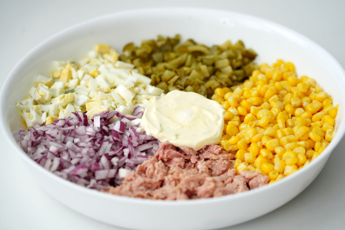 Салат отлично подойдёт как повседневное блюдо, а также на праздничный стол. · тунец консервированный – 1 банка · кукуруза консервированная – 1 банка ( большая) · яйца вареные 3-5 шт · лук – 1 средняя луковица · огурцы маринованные или свежие 2-3 шт небольшие · майонез 1-2 ст л · зелень по желанию Пропорции могут быть любыми, по вашему вкусу. Из банки с консервированным тунцом сливаем жидкость. Выкладываем тунца в глубокую миску и разминаем вилкой Отварные яйца, лук, огурцы режим мелкими кубиками. Чтобы салат ощущался максимально однородным, размер нарезки всех ингредиентов должен быть примерно равен размеру зёрен кукурузы. Все необходимые продукты смешиваем, заправляем майонезом. Желательно салату дать постоять 30 минут для объединения вкусов и подаем к столу.