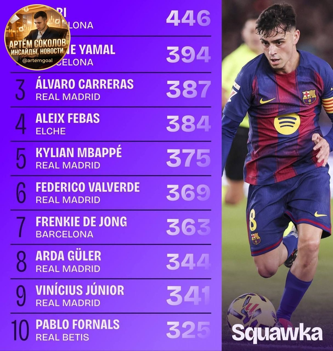 ? 🔝🏆 **Педри выполнил наибольшее количество передач в этом сезоне Ла Лиги** в заключительной трети, хотя он выходил в старте только в 14 из 22 матчей Артём Соколов | Инсайды, Новости