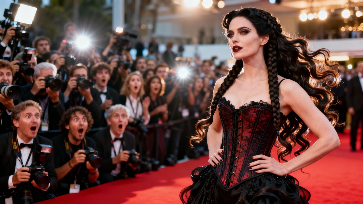 Одним из самых заметных трендов стали косы-корсеты - сложные полураспущенные укладки с лентами и эластичными элементами, напоминающими корсет. Такой образ можно было увидеть на Леди Гаге на «Грэмми-2026» и в фильме «Грозовой перевал», где прическа героини символизирует внутренние перемены персонажа. Это не историческая реконструкция, а фантазийная интерпретация, в которой сочетаются разные эпохи и современные детали.