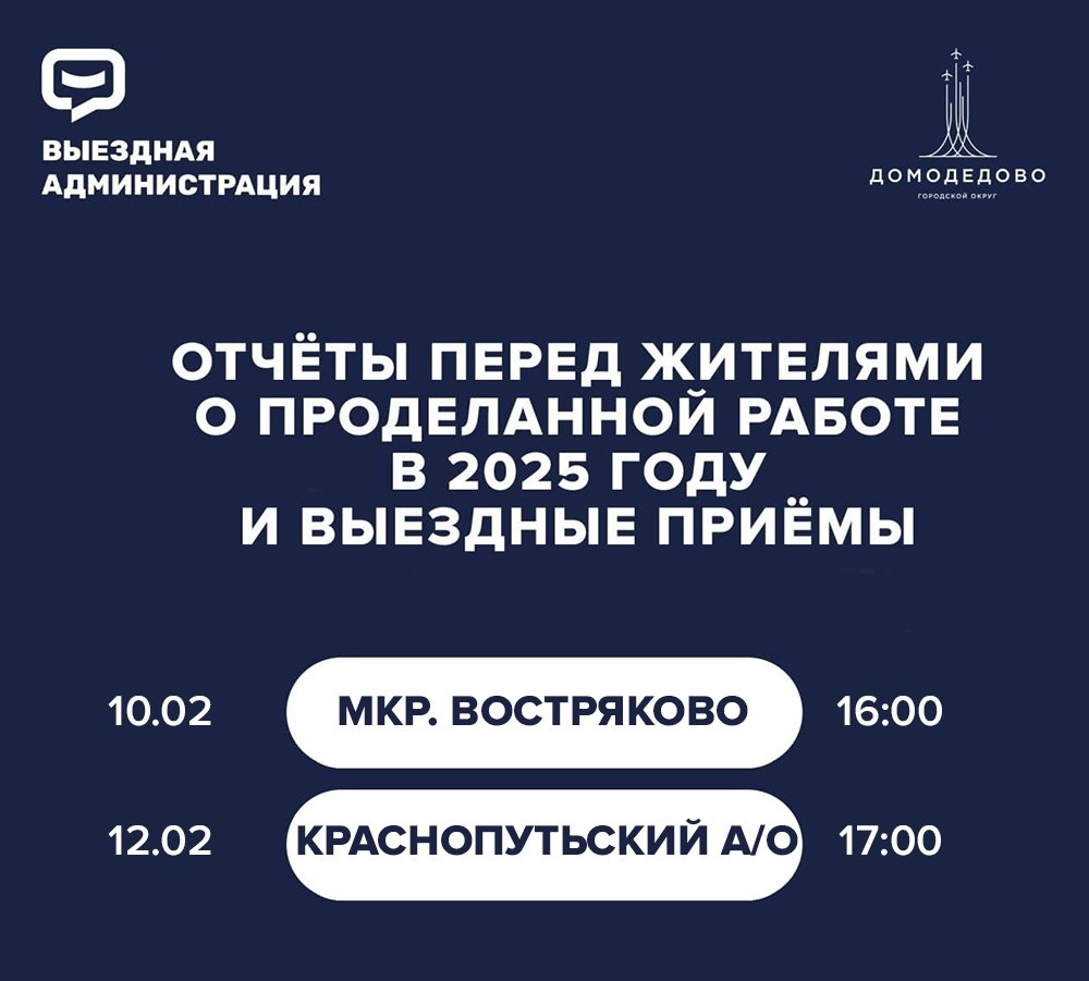 Востряково и Краснопутьского а/о. 📍 микрорайон Востряково 10 февраля в 16:00 ГДК «Востряковский» по адресу: мкр. Востряково, ул. Луговая, д. 1А 📍 Краснопутьский административный округ 12 февраля в 17:00 СДК «Русь» по адресу: с. Красный Путь, ул. Центральная, д. 2 Вместе с командой расскажем об итогах 2025 года и о планах на 2026-й. Встречи будут состоять из двух частей: сначала отчёт о проделанной работе, а затем ответы на вопросы жителей в рамках выездной администрации. Для удобства отчёты будут проходить в прямом эфире. Видеотрасляция будет доступна на моей странице ВКонтакте. Трансляции прошедших отчётов: - мкр. Авиационный: https://vk.com/wall861245566_7003 - Лобановский а/о: https://vk.com/wall861245566_7092 - мкр. Центральный: https://vk.com/wall861245566_7138 - Повадинский а/о: https://vk.com/wall861245566_7227 - мкр. Белые Столбы: https://vk.com/wall861245566_7266 - Пахринский а/о: https://vk.com/wall861245566_7303 - Никитский а/о: https://vk.ru/wall861245566_7