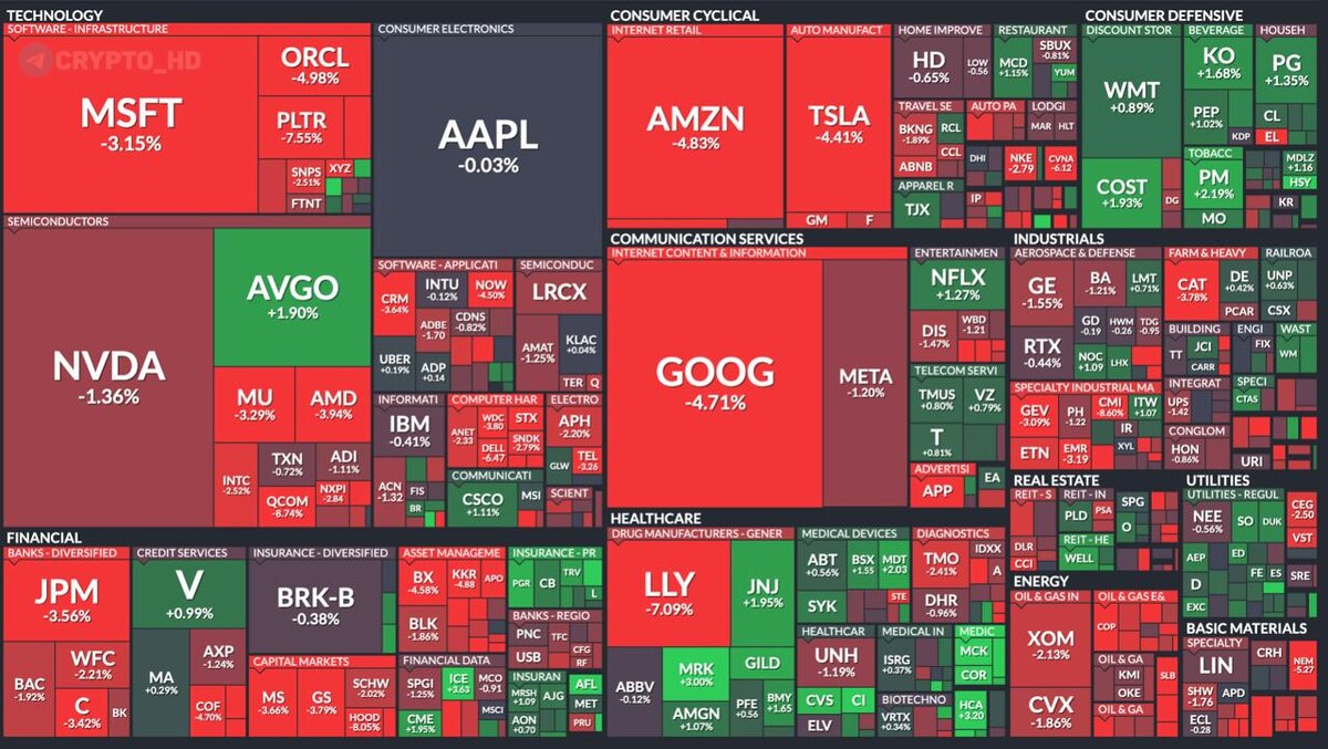 ➠ S&P 500 -1,36%, Nasdaq -1,53%. ➠ Bloomberg: Макроданные по рынку труда вызывают беспокойство о возможном замедлении экономики. Компании объявили о рекордных сокращениях рабочих мест – худший показатель с 2009 года ➠ Продолжается распродажа технологических акций, индексы снижаются третий день подряд. Ситуация напоминает январско-февральскую турбулентность 2025 года (события вокруг DeepSeek и Liberation Day). ➠ Инвесторы все более скептически относятся к огромным расходам технологических гигантов на AI. ➠ Отчет Alphabet разочаровал амбициозными планами материнской компании Google по капитальным затратам на искусственный интеллект. Не все компании могут убедить рынок в целесообразности таких инвестиций (Meta справляется лучше, Tesla и Microsoft – хуже). ➠ Происходит ротация капитала из технологического сектора в компании «реальной экономики». Инвесторы переключаются с поиска AI-возможностей на традиционные циклические отрасли. Crypto Headlines