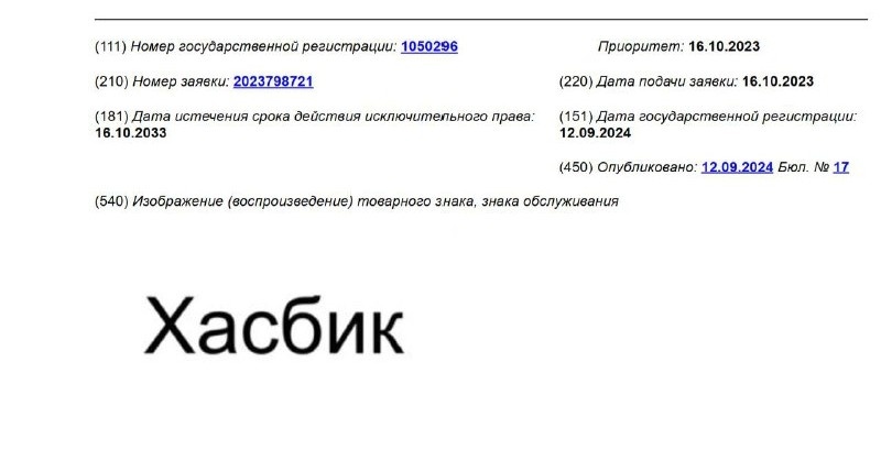 Согласно открытым данным Федеральной службы по интеллектуальной собственности Магомедову Гасбулле Магомедовичу принадлежат права на: 🔘 товарный знак № 1014793 в виде изображения блогера 🔘 товарный знак № 1050296 в виде слова "Хасбик" 🔘 товарный знак № 1014792 в виде слова "Хасбулла" Правовая охрана действует на товары и услуги 3, 9, 14, 16, 18, 20, 21, 25, 28, 29, 30, 32, 35, 41, 42 классов МКТУ. 👉 Среди них — значки, одежда, посуда, игрушки, печатная продукция, еда и напитки. Проверяйте свои товары на предмет соблюдения чужих интеллектуальных прав!