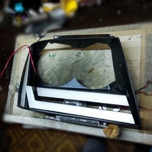 Т.е. вместо подхода с применением двух гибких лент разных цветов, для оранжевого цвета была вырезана простейшая плата и на ней размещены дорогущие корейские светодиоды, которые работали от 12в. За счет этого, по сути, плата была просто куском текстолита, поделенным надвое надрезом фольги, ибо нужен был только плюс и минус для ног светодиодов. Так это выглядело в выключенном виде уже в маске Комплект был собран по типу Сверхъяркий белый двухрежимный + оранжевые поворотники.