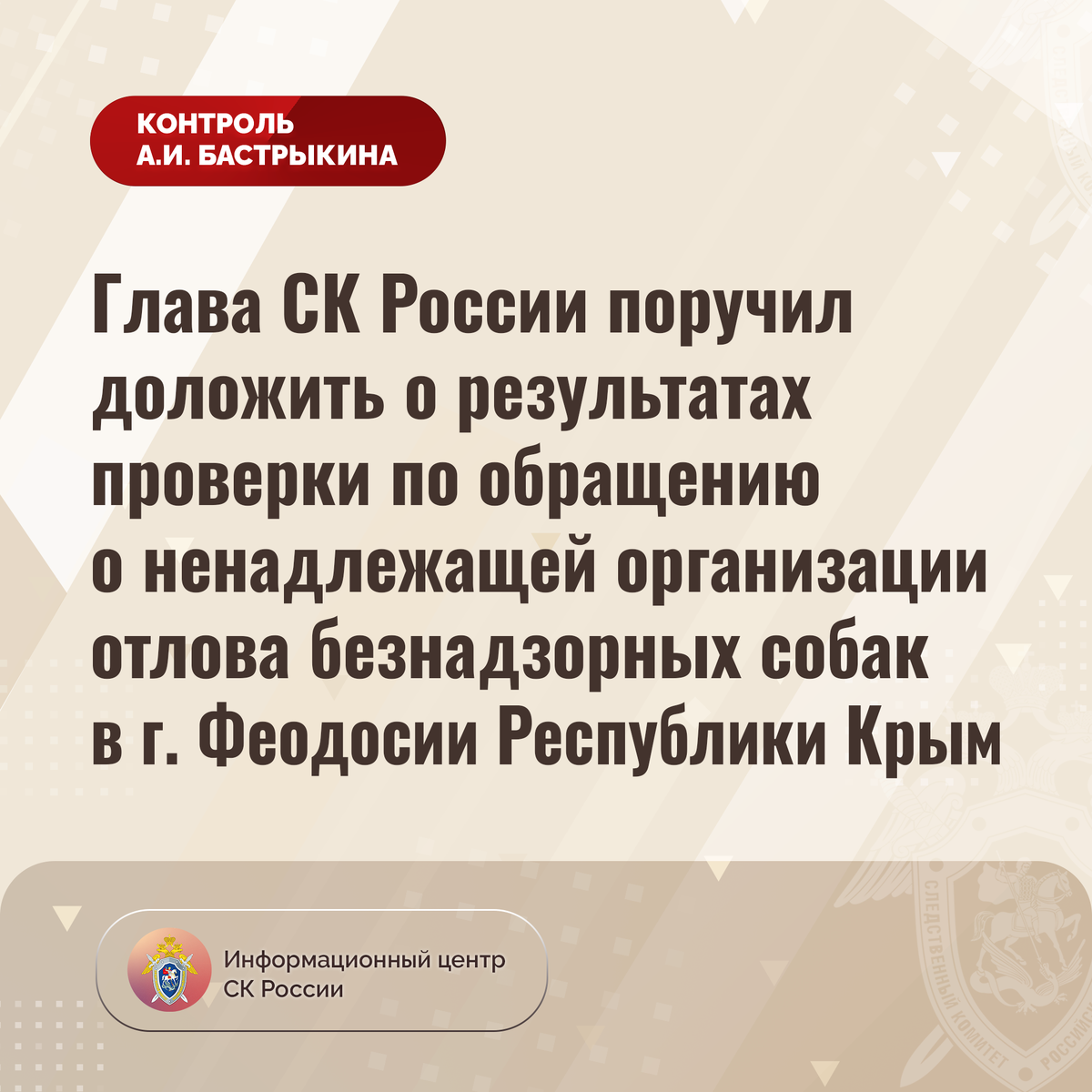Глава СК России поручил доложить о результатах проверки по обращению о ненадлежащей организации отлова безнадзорных собак в г. Феодосии Республики Крым В комментариях в аккаунте приёмной Председателя СК России А.И. Бастрыкина в социальной сети «ВКонтакте» поступило обращение по вопросу бездействия профильных структур в городе Феодосии Республики Крым при организации отлова безнадзорных собак. На протяжении длительного времени вблизи остановки общественного транспорта обитает большое количество животных без владельцев, которые систематически нападают на граждан. Местные жители опасаются за свою безопасность. В ГСУ СК России по Республике Крым и городу Севастополю организована процессуальная проверка. Председатель Следственного комитета Российской Федерации Александр Иванович Бастрыкин поручил руководителю ГСУ СК России по Республике Крым и городу Севастополю Владимиру Николаевичу Терентьеву доложить о промежуточных результатах процессуальной проверки и принятом по итогам решении. Испол