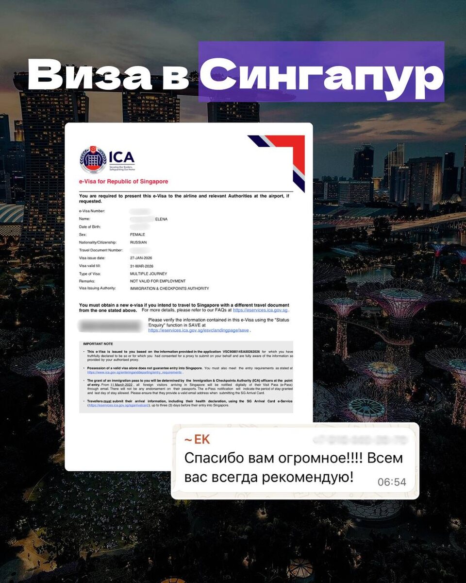 #vte_кейсы 🔜 Элина обратилась к нам за помощью 12 января, так как у ее мамы планировалась туристическая поездка в Сингапур с 30 января. Ранее мы помогали ей с оформлением шенгенских виз, но в Сингапуре она еще не была, так что это был первый опыт для нее. 🔜 16 января мы направили все необходимые документы. 🔜 Рассмотрение длилось 2 полных рабочих дня. Мама Элины получила мультивизу на 2 месяца. 🔜 Теперь о нюансах, которые необходимо учитывать при подаче на визу в Сингапур: 1⃣Сроки подачи Подача документов осуществляется не ранее, чем за 30 дней до поездки, и не позднее, чем за 7 дней до вылета. 2⃣Требования к фотографии 😮цветная, 3.5 см × 4.5 см на белом фоне; 😮размер овала лица не более 65 % от общего размера; 😮плечи должны быть видны, у заявителей с длинными волосами должны быть открыты уши; 😮фотография должна быть сделана не более 3 месяцев назад; В процессе подготовки документов для мамы Элины была проведена обработка ее фотографии, так как она не подходила по тре