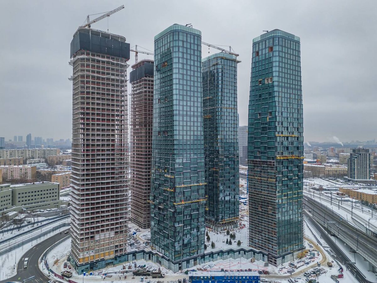 ». На этих объёмах сейчас выполняется устройство последних технических этажей, а также бетонных кровельных конструкций. Башни «Topaz» и «Emerald» остеклены на 96%. «Amber» — на 75%. Это всё первая очередь, которую застройщик намерен ввести в эксплуатацию уже в третьем квартале текущего года. #riverparkкутузовский 😊 Небоскрёбы России