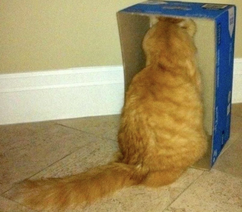 Эта картонная конструкция явно не рассчитана на размеры этого кота, но ему абсолютно всё равно, и он наслаждается своим неудобным, но абсолютно законным пьедесталом.