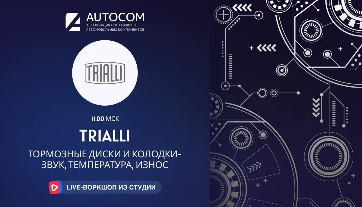 Тема встречи: «Тормозные диски и колодки: звук, температура, износ». Спикер: Антон Павлишин — представитель бренда. Ведущий: Андрей Акимов — специалист AUTOCOM. В прямом эфире спикеры обсудили ассортимент компании TRIALLI, особое внимание уделили тормозным дискам и колодкам. Представитель бренда рассказал о его истории и новостях. В конце спикер и ведущий ответили на вопросы подписчиков, провели викторину. Автор лучшего вопроса и победитель викторины получили призы. Чтобы не пропустить следующие воркшопы и анонсы подписывайтесь на соц.сети компании AUTOCOM: сообщество ВК «AUTOCOM Россия»; Telegram чат «Автосервис как успешный бизнес». мы в МАХ АВТОСЕРВИС КАК УСПЕШНЫЙ БИЗНЕС.