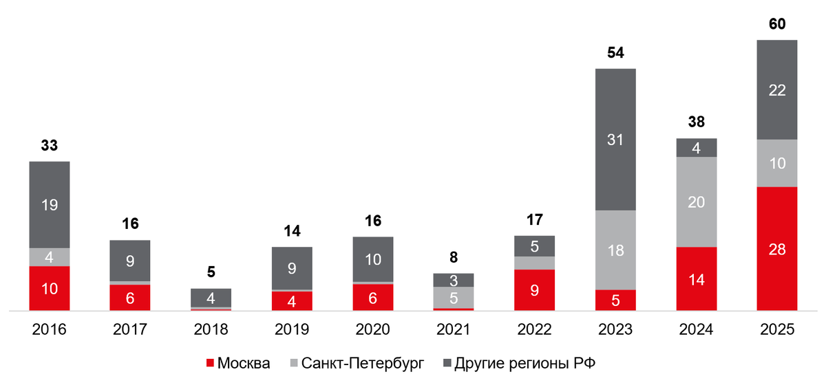 Объем инвестиций в гостиничную недвижимость в 2025 годуобновил рекорд последнего десятилетия, увеличившись год к году более чем в 1,5 раза. Согласно данным консалтинговой компании IBC Real Estate, совокупный объем инвестиций в сегмент гостиничной недвижимости в целом по России по итогам 2025 года достиг 60 млрд руб., что на 57% превышает показатель 2024года (38 млрд руб.), а также превосходит значение 2023 года (54 млрд руб.), которое ранее считалось рекордным. Новый максимум обеспечен закрытием целого ряда знаковых для рынка сделок – продажи Swissotel Resort Камелия в Сочи,Hyatt Regency Moscow Petrovsky Park в Москве, загородного отеля LesArt Resort в Московской области, а также проекта реконструкции здания бывшей гостиницы «ЛюксЪ» на Тверской улице. Динамика объема инвестиционных сделок с гостиничной недвижимостью России, млрд руб.