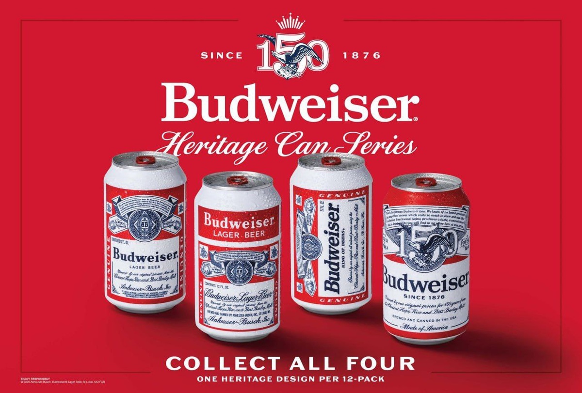 Набор из четырех разных дизайнов включает этикетки, вдохновленные банками Budweiser 1950-х, 1970-х и 1990-х годов. #пиво