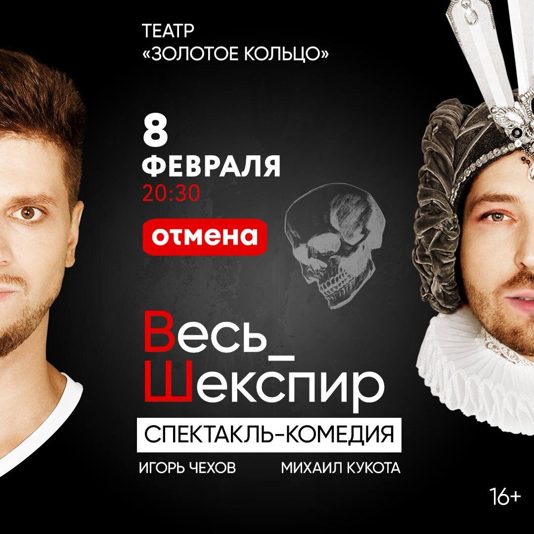 Друзья, к сожалению, спектакль «Весь Шекспир», который должен был состояться 8 февраля в Москве отменен