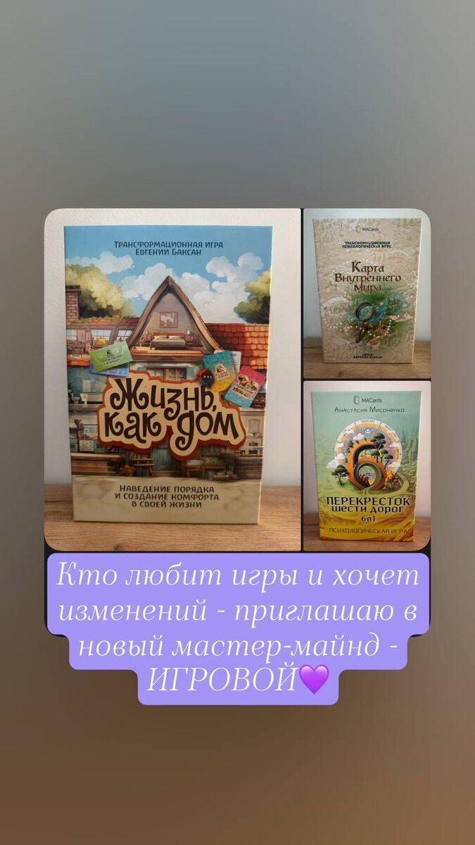 Я люблю ММ и очень люблю трансформационные психологические игры. Я задумалась, как можно соединить эти два направления. И загорелась идеей создать нечто, чего ещё не было на рынке мастер-майндов — игровое пространство для личных изменений. И ответ пришел. Представляю вам уникальный формат: Игровой Мастер-Майнд. Это 4 недели глубокой, но удивительно лёгкой практики, где главный инструмент — это трансформационные психологические игры 🎲 Я хочу попробовать такой формат вместе с вами и показать, что трансформация может быть увлекательным путешествием, а не тяжёлой работой. Поэтому стоимость всего мастер-майнда (4 игры) равна стоимости одной отдельной игры. Что вас ждёт? За 4 недели мы сыграем в 4 мощные психологические трансформаторные игры (фото игр в комментариях): 1. «Жизнь как дом» — баланс в основных 7 сферах жизни 🏡 2. «Карта внутреннего мира» — универсальная игра для любого запроса и поиска ответов через бессознательное, которое знает все 🗺️ 3. «Перекрёсток 6 дорог» — найти сп