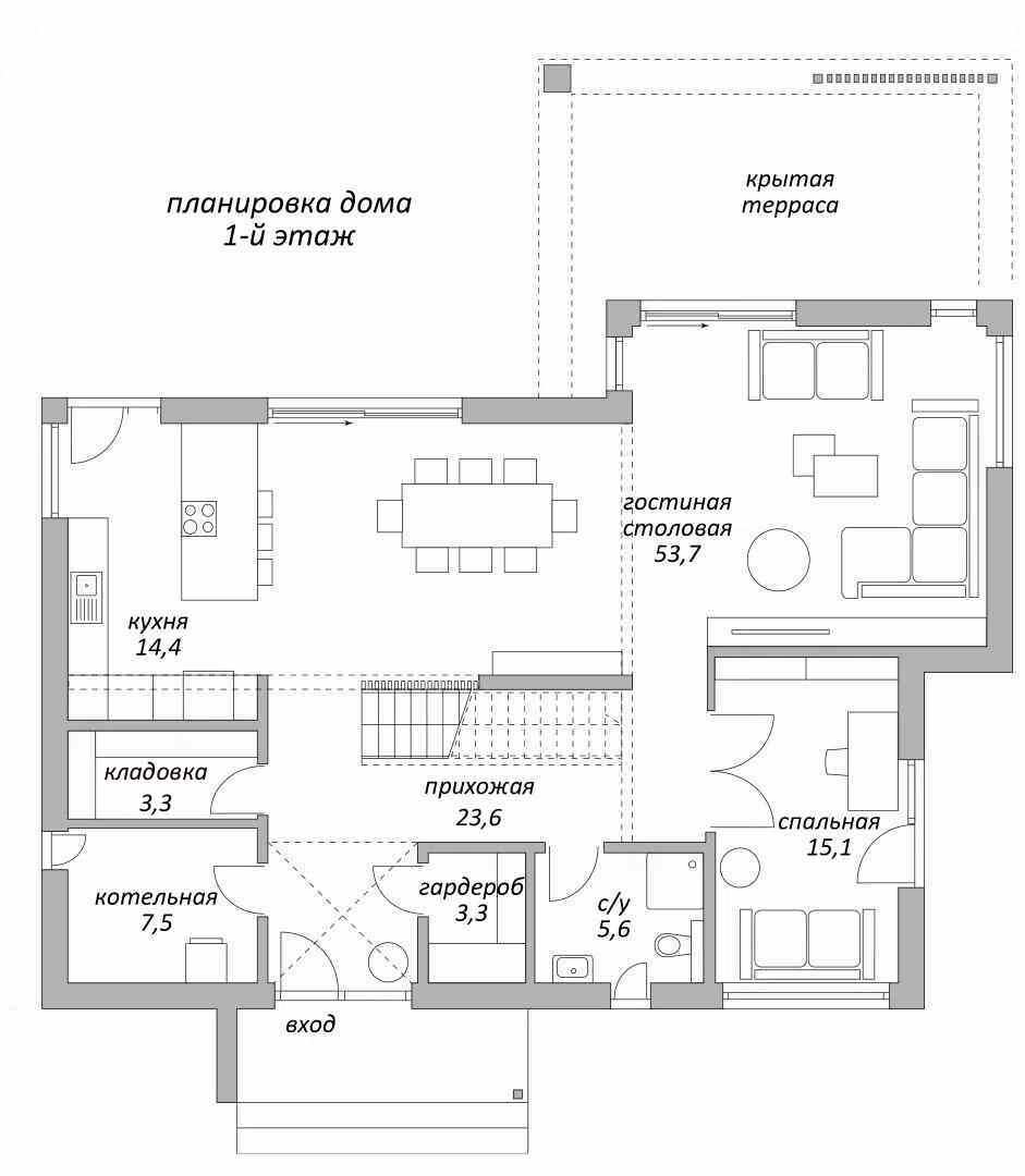Полутораэтажный дом представляет собой гармоничное сочетание современного минимализма и функциональности. Лаконичные формы фасада дома, большие площади остекления и продуманное зонирование делают его идеальным выбором для комфортной загородной жизни. Разработаем проект дома под ключ (архитектура, конструктив, инженерные системы) по публикуемой концепции, предназначенной под строительство из кладочных материалов (кирпич, блоки). Первый этаж: простор для жизни и приема гостей. Сердцем проекта дома является просторная объединенная зона кухни-гостиной-столовой площадью более 50 м2. Благодаря панорамным окнам от пола до потолка помещение наполняется естественным светом, а раздвижные стеклянные двери дома стирают границу между интерьером и большой крытой террасой. Также на первом этаже расположены: изолированная комната (15,1 м2), которую можно использовать как гостевую спальню или полноценный рабочий кабинет. спроектирована функциональная входная группа дома с отдельной гардеробной. техниче