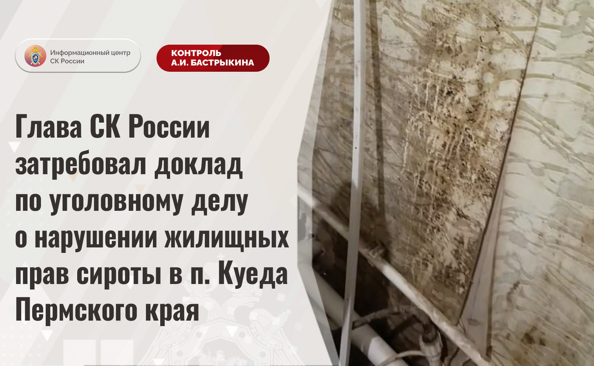 Глава СК России затребовал доклад по уголовному делу о нарушении жилищных прав сироты в п. Куеда Пермского края В социальной сети сообщается о нарушении жилищных прав сироты в поселке Куеда Пермского края. В 2021 году семью молодого человека с четырьмя детьми, один из которых инвалид, обеспечили жилым помещением в новостройке во 2-м Звонком переулке. Однако в ходе его эксплуатации выявлены дефекты, препятствующие дальнейшему проживанию: ввиду ненадлежащего состояния инженерных систем в квартире образуется влажность, в стенах появились трещины, вода, поступающая из скважины, непригодна для потребления. Обращения в различные инстанции результатов не принесли. В СУ СК России по Пермскому краю возбуждено уголовное дело. Председатель Следственного комитета Российской Федерации Александр Иванович Бастрыкин затребовал у руководителя СУ СК России по Пермскому краю Дениса Валерьевича Головкина доклад о предварительных и окончательных результатах расследования уголовного дела. Исполнение поруче