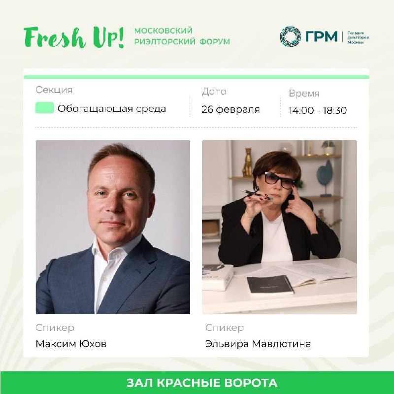 📆 26 февраля 🕘 14:00–18:30 📍 зал Красные ворота 🗣 Спикеры: Максим Юхов — «Недвижимость Крыма — новые возможности» Эльвира Мавлютина — «Как создать клиентскую базу, работая с покупателем» Эта часть секции — про расширение горизонтов, устойчивую базу и долгосрочный рост в профессии. Если вы хотите: ✅ видеть больше возможностей рынка ✅ работать системно, а не от сделки к сделке ✅ усиливать результат без выгорания — включайте секцию «Обогащающая среда» в свой план Fresh Up 2026. ⚠️ Участие бесплатное, количество мест ограничено и доступно до 12 февраля. 🔗 Регистрация на форум и подробная программа — на сайте Fresh Up 2026.
