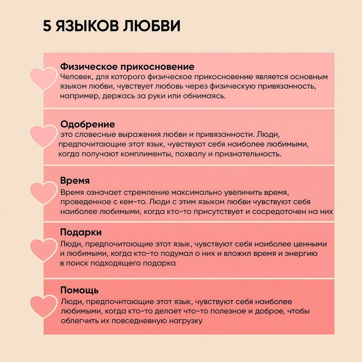 «Мой язык любви – это подарки», – говорит на Патриках юная, откровенно одетая девушка из тех, что в вирусных роликах утверждают: «Мой мужчина должен зарабатывать от 3 миллионов рублей в месяц, а я буду его вдохновлять!» Понятное дело, что ни о какой любви здесь речи не идет, девушка просто хочет псевдонаучно обосновать свои дутые запросы. Вы же слышали о 5 языках любви? 5 языков любви – это популярная сейчас концепция. Она много лет ходит в пересказах по соцсетям и используется некоторыми психологами. Я, кстати, тоже иногда её упоминаю на консультациях. Ну а что, модель очень понятная. Если коротко, то существует 5 языков любви: слова поддержки, время, проведенное вместе, прикосновения, помощь и подарки. Для каждого человека особенно важно что-то своё. Мужчины, например, очень ценят, когда женщины признают их компетентность и хвалят. Они от такого, как коты от валерьянки. Консультировал недавно клиентку, которая с грустным видом рассказывала, что на новогодних каникулах ей было очень о
