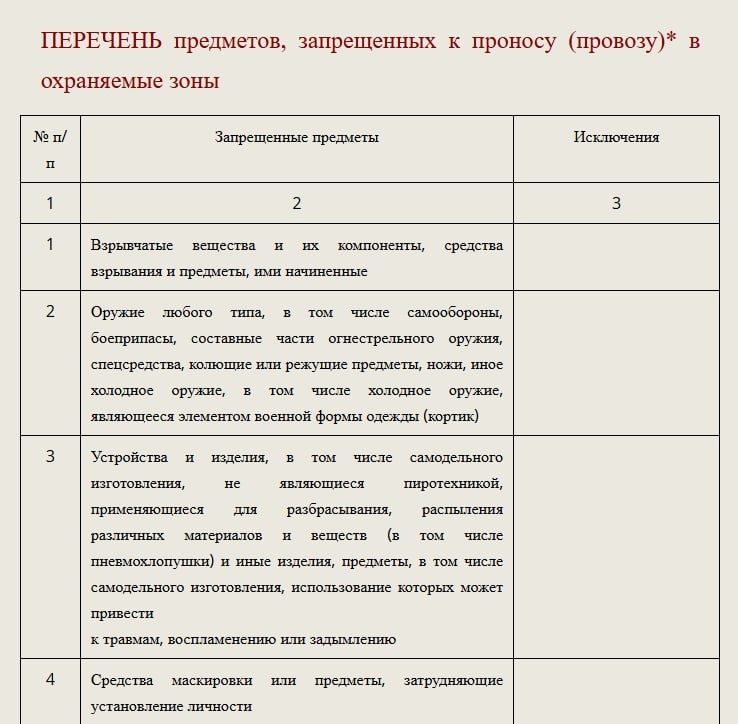 ❌ Перечень предметов, запрещенных к проносу и провозу в охраняемые зоны во время проведения охранных мероприятий 7 и 9 мая, определен Федеральной службой охраны Российской Федерации. В списке есть как оружие и взрывчатые вещества, так и аэрозольные баллончики, пластиковые контейнеры,, баннеры и продукты питания (яйца, кетчуп, майонез и т.д.). Также нельзя проносить алкоголь, животных, все виды жидкостей больше 50 мл, включая парфюмерию и средства личной гигиены, вейпы и электронные сигареты. Подробнее со списком можно ознакомиться на сайте Федеральной службы охраны РФ. НАШ ИНФОРМАЦИОННЫЙ ПОРТАЛ