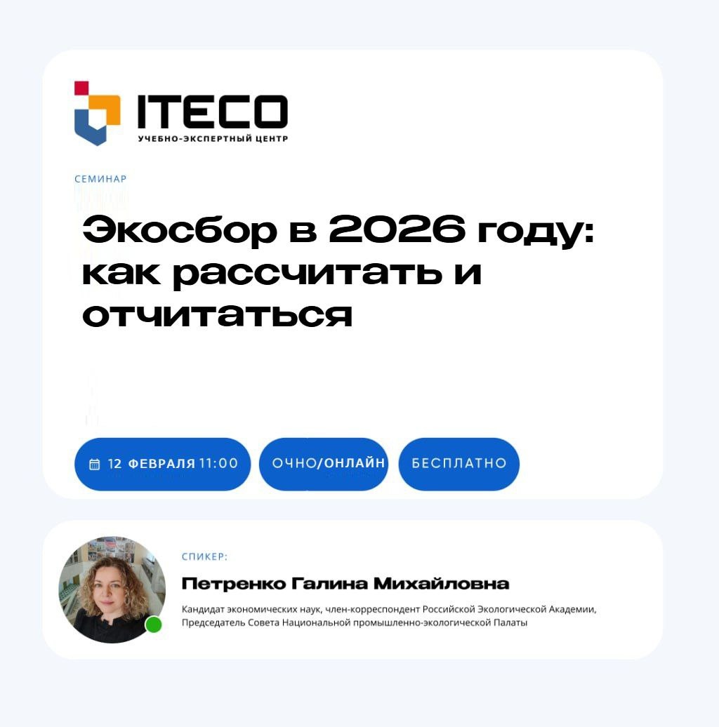 С 2026 года Росприроднадзор усилил контроль за уплату экосбора. Экологический сбор взимается с производителей и импортеров товаров и упаковки, отходы от использования которых подлежат утилизации. К ним относятся текстильные изделия, изделия из бумаги и картона, шины, резиновые изделия, электроприборы и т.д. 12 февраля на семинаре подробно разберем, как отчитываться и рассчитывать экосбор в 2026 году. 🗓 Старт: 12 февраля в 11:00 📢 Формат: очно и онлайн 💳 Стоимость: бесплатно 📍Адрес: Московская область, г. Подольск, ул. Комсомольская, д. 28, стр. 2, 5 этаж, аудитория 506 (БЦ «Пассаж») Спикер: 👩🏼 Петренко Галина Михайловна — кандидат экономических наук, член-корреспондент Российской Экологической Академии, Председатель Совета Национальной промышленно-экологической Палаты 🔗 Записаться
